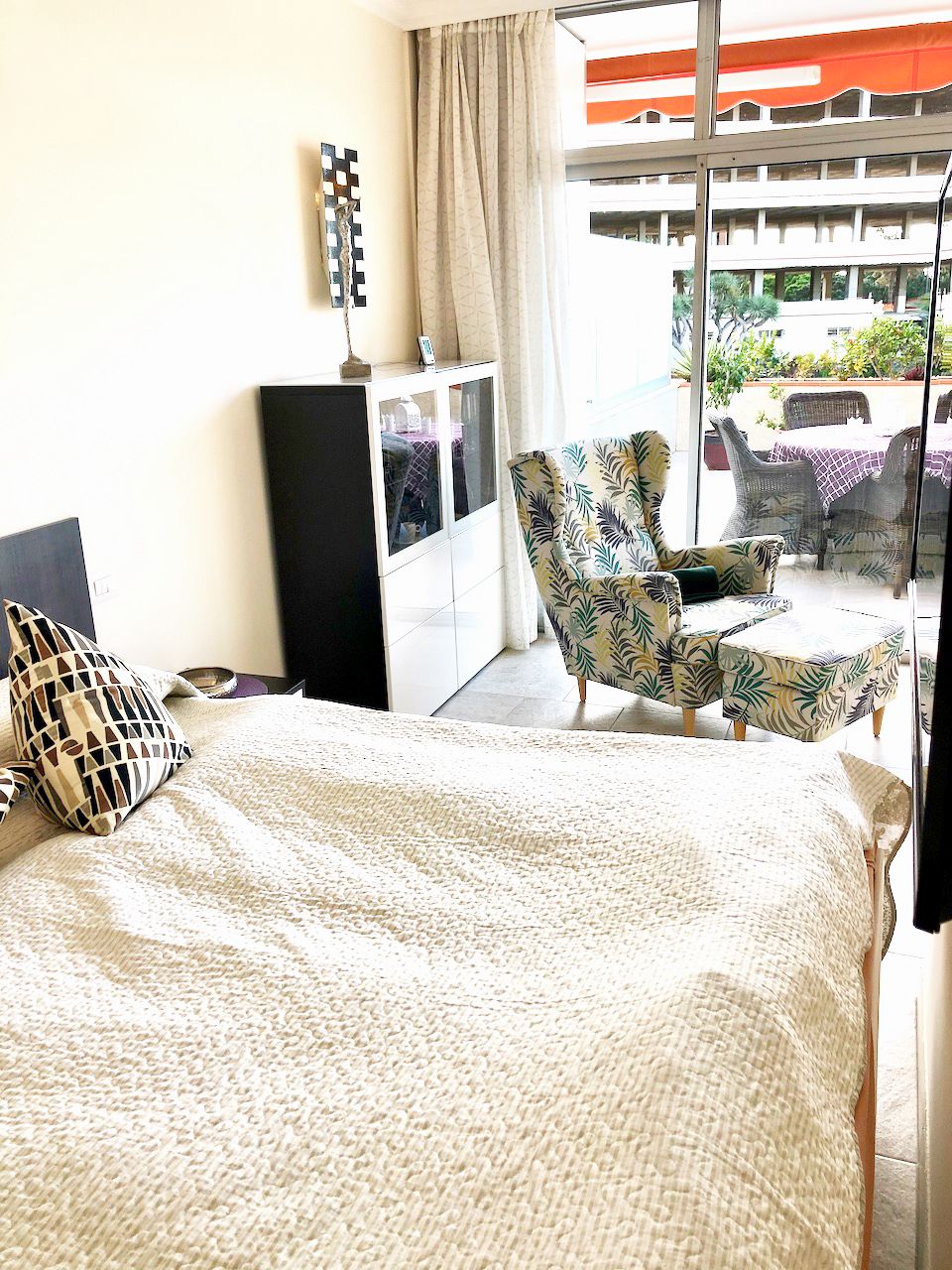 ... in Studioform mit integriertem Schlafbereich (Doppelbett), modern und hell eingerichtet, Fernseher mit Internetanschluss, deutsche und spanische Programme zur Auswahl inkl. Radiosender, Relax-Sessel, Couch.