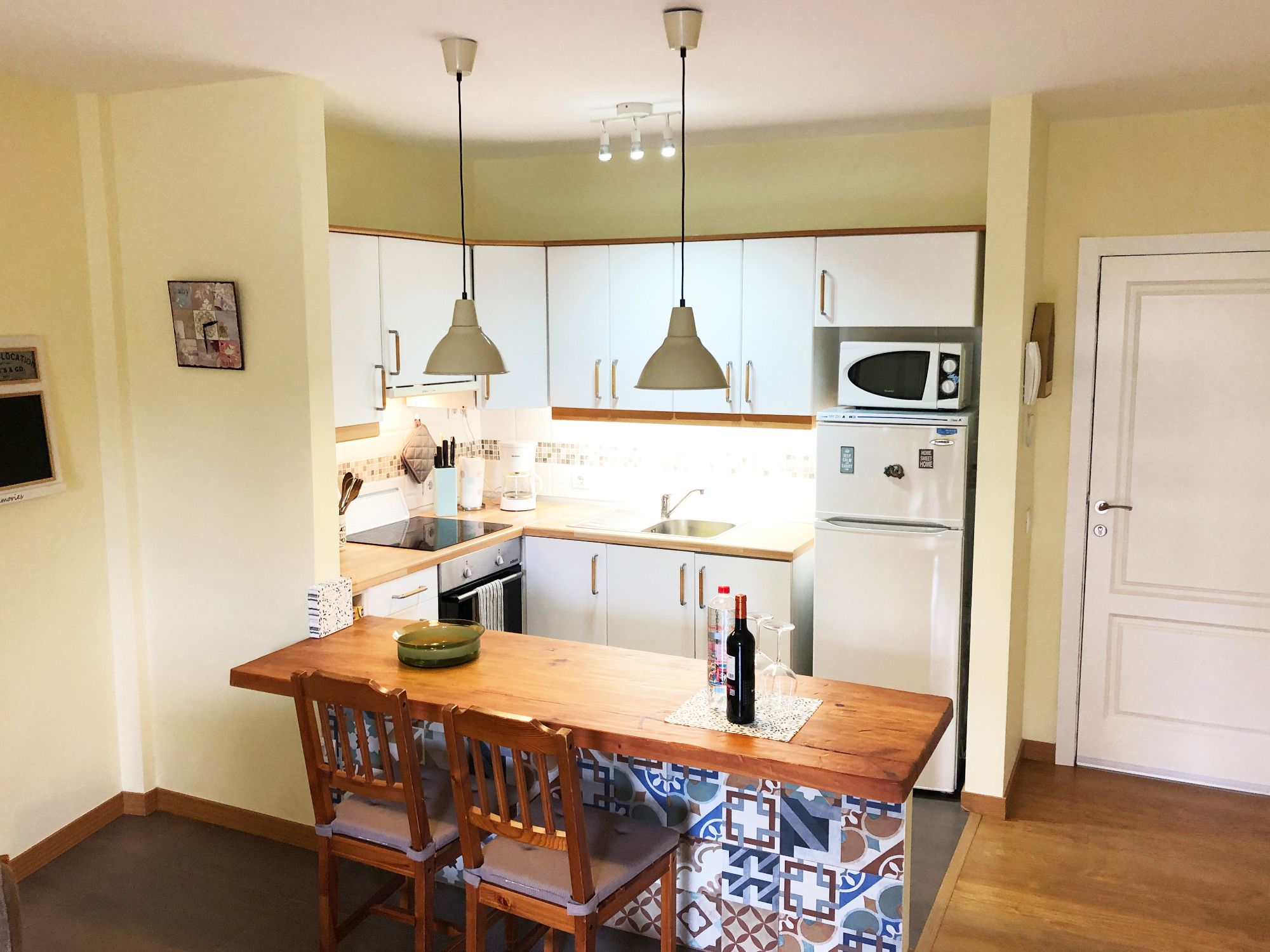 Ausstattung: Wohnzimmer mit offener Küche und Esstresen. Voll ausgestattete Küche. Ceranfeld, Backofen, Kombi-Kühlschrank, Mikrowelle, Kaffeemaschine, Toaster, Geschirr und andere wichtige Küchenutensilien.